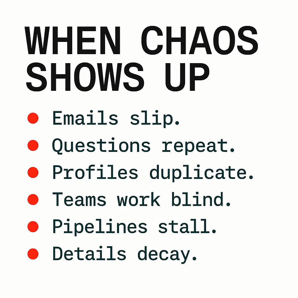 Here are warning signs that contact management software is overdue in your workflow. Each point shows a specific problem that’s costing energy and clarity.
