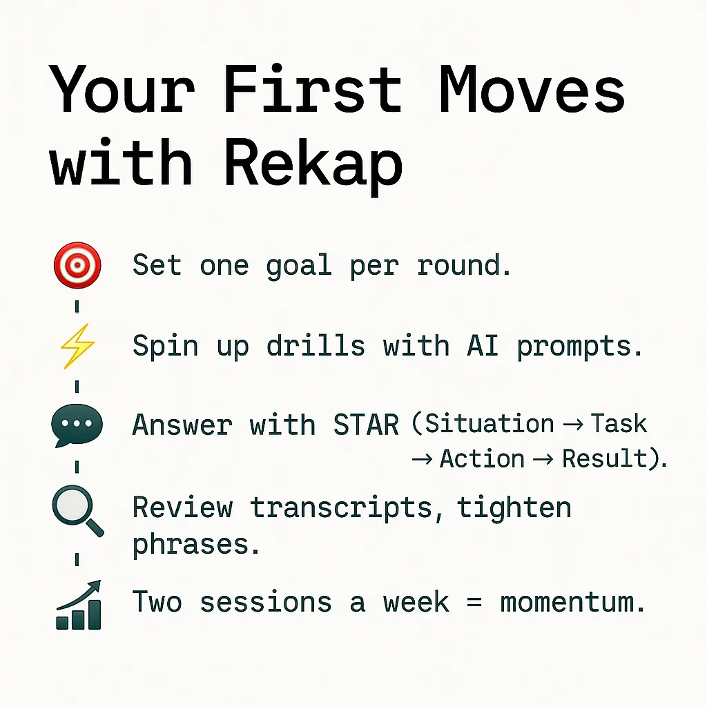 Interview prep for grads should build confidence, not stress. Rekap powers real practice with AI that captures answers, scores clarity, and drives steady improvement. Sessions turn into motion, feedback becomes action, and graduates walk into interviews clear, prepared, and authentic.